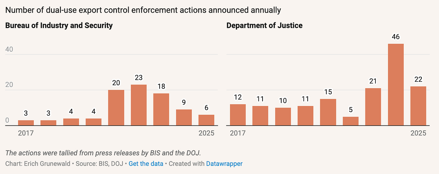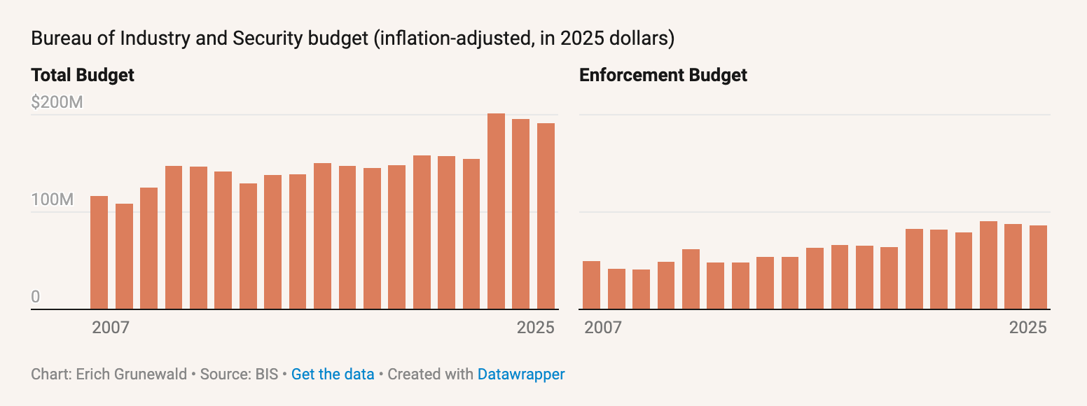 BIS’s entire budget for fiscal year 2025 was about $191 million, likely far smaller than the collective profits of AI chip smugglers alone, which may well have exceeded $1 billion. A single successful enforcement action against a major smuggling operation could pay for BIS’s entire annual budget—for example, last month US authorities arrested three individuals accused of smuggling AI chips worth $160 million to China, which could result in a penalty of $320 million. There are likely dozens of such cases remaining to be discovered. A BIS whistleblower program like the one described in the SSOCA could create a virtuous cycle where more tips and better enforcement lead to more penalties and rewards, which in turn leads both to more tips by publicizing the program and also more resources for enforcement.