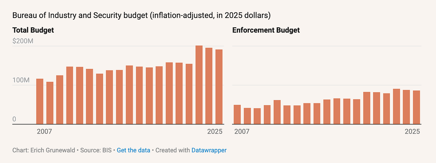 At this point, the wise reader will ask, “Isn’t BIS extremely resource constrained? If so, how is it supposed to process and investigate a bunch of incoming tips, determine awards, and carry out outreach on the program?” After all, BIS’s budget for enforcement has been essentially flat when accounting for inflation for at least the past five years (see figure), despite BIS receiving a vastly increased scope of responsibilities due to the AI chip export controls introduced in October 2022 and the Russian invasion of Ukraine and all the diversion related to that conflict.